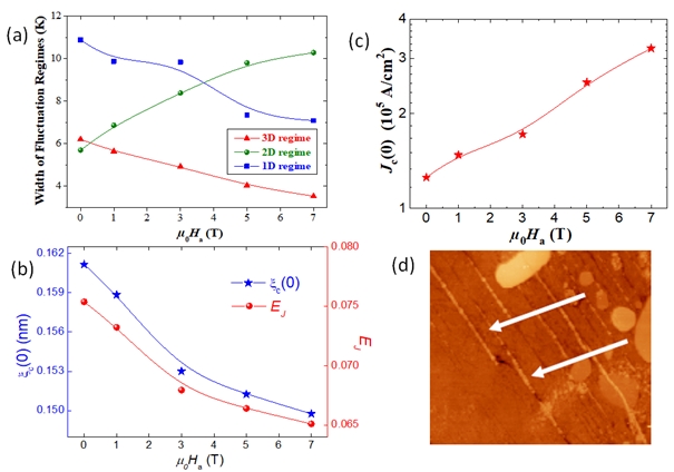 Figure 5. (a) The widths of the 3D-, 2D-, and 1D-fluctuation regimes plotted versus the applied magnetic field, μ0Ha. The lines drawn serve as guide for the eyes. The width of the 3D- and1D-regimes decrease on increasing the applied magnetic field, whereas the width of the 2D-regime is found to increase. (b) Variation of the zero-temperature coherence length along the c-axis, ξc(0), and the interlayer Josephson coupling strength, EJ , as function of the applied magnetic field. The lines drawn serve as guide for the eyes. (c) Variation of the current density at 0 K, Jc(0), as function of the applied magnetic field, μ0Ha. The red line drawn serves as guide for the eyes. (d) AFM topography image indicating that many nanometer-sized Y-211 particles (bright) are located within the grain boundaries (grooves) in between the YBCO grains, revealing details of the minuscule Y-211 particles (bright, marked by white arrows).