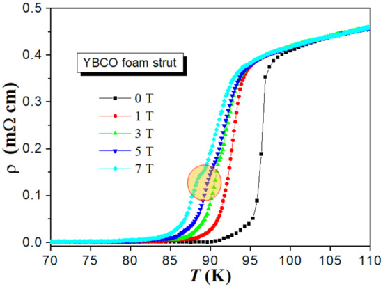 Struts from the large YBCO foam sample were broken out and electrical contacts to the foam struts were made by gold wires and silver paste with an additional baking process at 150 °C to achieve small contact resistivities. Resistance was measured in a Physical Property Measurement System (PPMS) with 9 T applied magnetic field (Quantum Design) using the standard four probe terminal method. Excitation currents (1 – 10 mA) were injected along the major length of the foam strut.