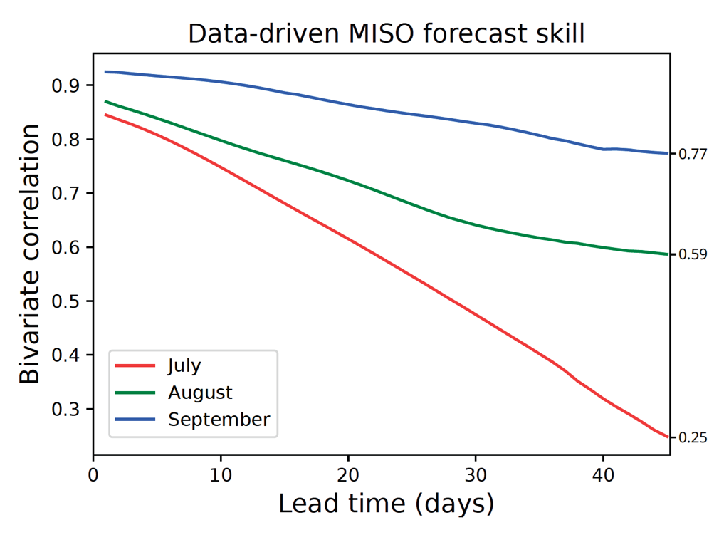 Figure 1. Time-varying correlation coefficient between predicted and observed monsoon intraseasonal oscillation (MISO) modes, for forecasts initiated on the 1st of July, August, and September, spanning the years 2008 to 2016. (Bach et al. (2024) [26])