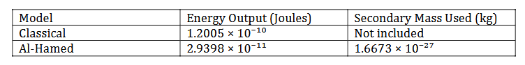 The following chart provides a visual comparison of the energy outputs calculated using the classical model and the Al-Hamed Electro-Nuclear Equation. It clearly illustrates the reduction in predicted energy output when accounting for secondary particle mass and electric input: