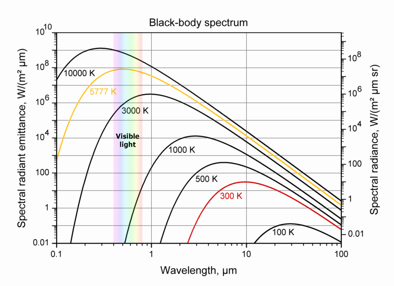 In the above image you can see at which wavelength (or colour) bodies of a certain temperature emit their maximum intensity. A star with a surface temperature of, for example, 10000 K emits the majority of its radiation in the ultraviolet range and still a significant amount in the blue range of visible light. A star with a surface temperature of 4000 K has its peak emission in red. That's why hotter stars appear bluer and cooler stars redder. If we want to observe all the objects in the universe that emit radiation we cannot just observe the visible light, we also need to look at all the other wavelengths. Only with help of infrared and radio telescopes will we be able to detect cooler objects, such as brown dwarfs, dust or molecular hydrogen. With X-ray telescopes we can much better distinguish the sources of high energy radiation, such as black holes and neutron stars.