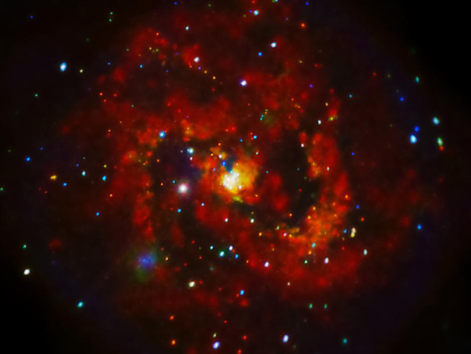 Gamma rays and X-rays are the radiations with the highest energy. Only objects of temperatures from a million to hundreds of millions degrees Kelvin (K) emit this kind of radiation. Matter falling into a black hole or a neutron star is accelerated and heated up to millions of degrees. So gamma rays and X-rays tell us where these objects are located. The bright red spot to the left side of the galaxy's centre is a so-called ultraluminous X-ray source; a black hole or neutron star that accretes matter from an accompanying star. In this image of the galaxy's centre you can also observe a lot of hot gas with temperatures of many millions of degrees K.
