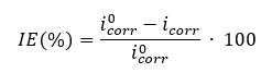 Calculating the corrosion rate of the metal specimens based on the potentiostatic polarization curves required taking into account the corrosion current density, . This was accomplished by linear extrapolation of anodic and cathodic Tafel slopes of the polarization curves. The inhibition efficiency, IE%, was calculated with the formula:
