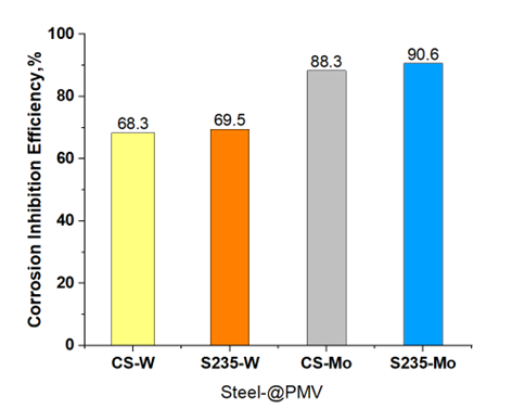 The acquired data reinforce that, even in the context of mild steels, polyoxometalate containing Mo exhibits a more effective protective effect. This finding demonstrates that Mo serves as an oxidizing species with passivating capabilities that surpass those of W.