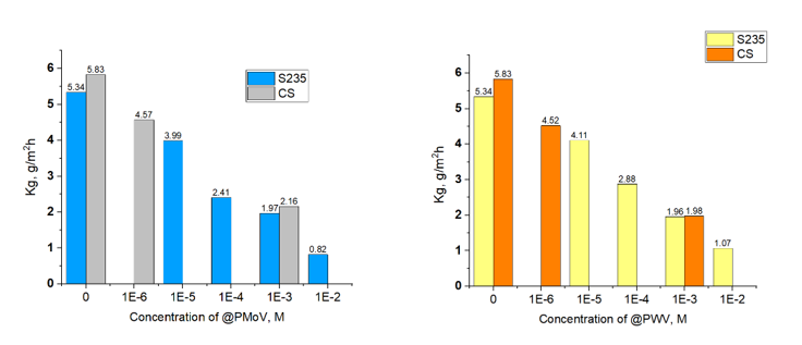 The corrosion rates exhibit a gradual decline as the concentration of PMoV increases, suggesting that PMoV may serve as a more effective inhibitor compared to PWV. However, it is worth noting that even at a level of 0.01 M, the corrosion rates remain considerable.