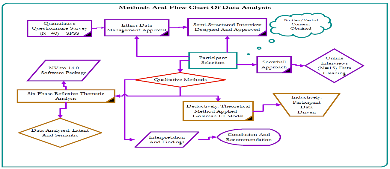 The study employed an analytical survey using both mixed methods, including quantitative and qualitative approaches, to establish the associations between emotional intelligence and decision-making to improve productivity. Different analyses were used for each respective data analysis. Highlighting the flow of the chart. The analysis presents a comprehensive result from the qualitative data collected through in-depth, semi-structured interviews with 14 participants within the UK construction industry. The sample comprises construction professionals, and 40 survey questions were analysed using SPSS software. Additionally, the study employed the six-phase reflexive thematic analysis (RTA) by Braun and Clarke (2022) for analysis, and NVivo 14.0 software was also used. The study benefitted from an inductive approach; responses from participants (P10 and P12) reveal key themes related to the role of emotional intelligence (EI) in decision-making processes. These responses suggest that EI is a fundamental element in how construction professionals address clients' and stakeholders' needs, adapt to situational challenges, and ensure effective project outcomes.