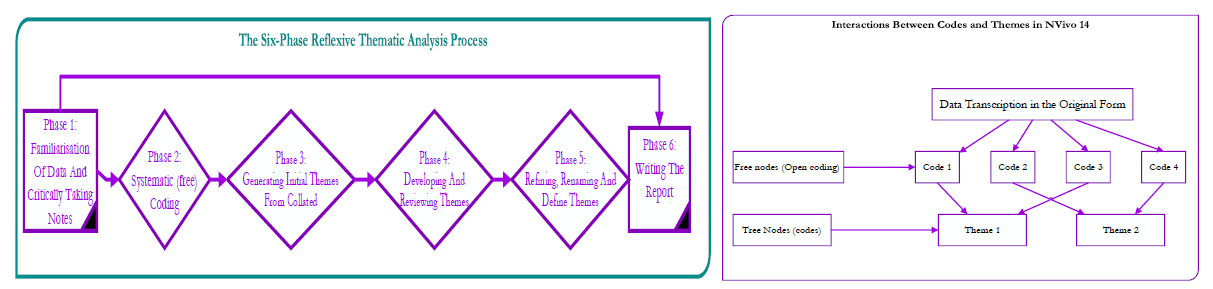 Figure 3. Six-Phase Braun and Clark Reflexive Thematic Analysis. This figure illustrates the steps involved in analysing the data phases, while the second figure highlights the progress made and details how it was coded and thematised.