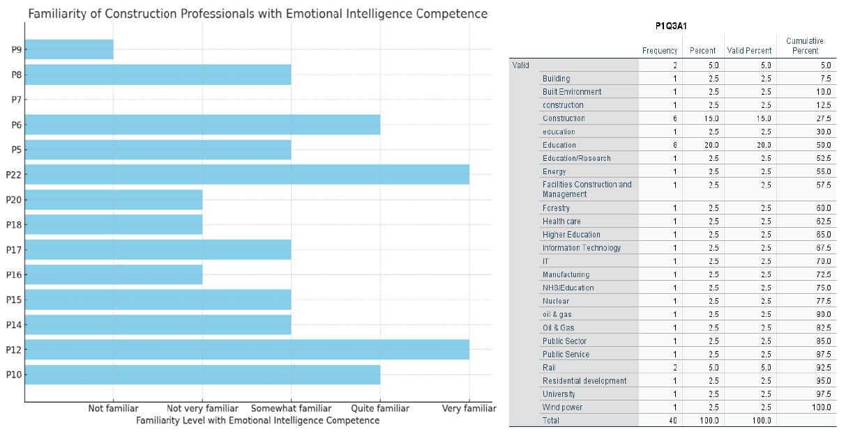This figure illustrates the extent of familiarity with emotional intelligence among professionals in the construction industry. Fourteen construction professionals participated in a qualitative semi-structured interview and were asked about their familiarity with the concept of emotional intelligence. Very few reported being familiar with EI, as they had received training in their previous jobs before entering the construction industry. At the same time, a fair number of participants were somewhat familiar with the concept. Meanwhile, a majority indicated that they were unfamiliar with it. This suggests a low level of awareness of EI among construction professionals. Furthermore, 40 participants completed the quantitative questionnaire survey, as seen on the right side of Figure 4 above.