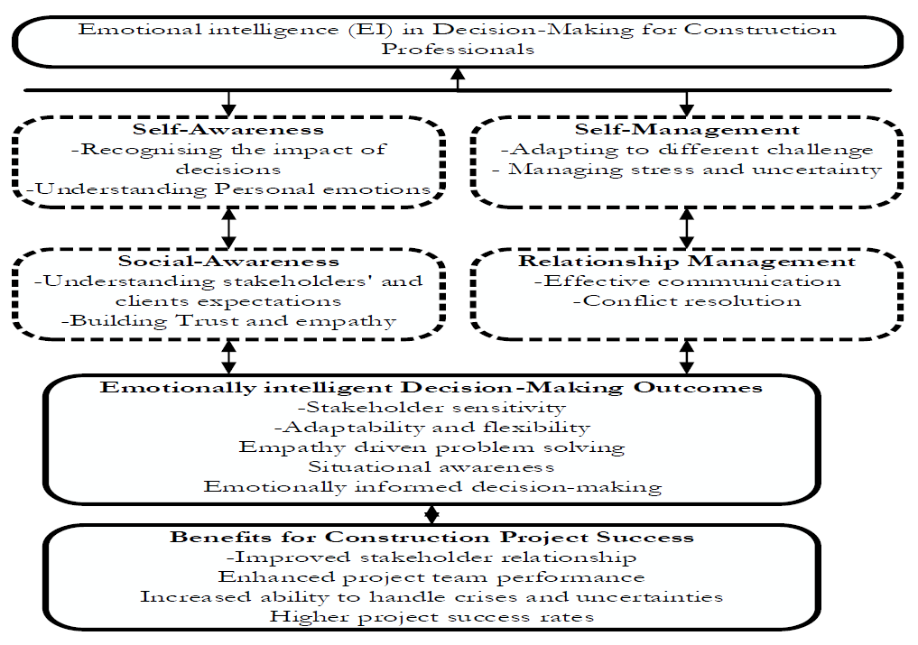 The role of emotional intelligence cannot be underestimated with regards to the impact of productivity and decision making. EI create an in-depth understanding of the practical aspects of project management day-to-day project operations from the soft skill perspective[6]. A construction professional with a high level of EI is better equipped to manage their emotions when the stakes and project challenges are high such as project delays, safety concerns or risks issues[6][7]. The works of Afshari and Ghamkhar (2023) suggest a positive correlation between EI and high productivity and team success[18], of which aligns with that of Zhang and Fan (2013) they linked high EI to improved project performance particularly in mega projects[19]. This is because EI supports rational thinking, under pressure which helps the project manager remain calm and focused[20]. The justification for the emphasis on the construction industry in this study is that there has been a robust loss of revenue within this sector due to project failures caused by human error factors. Studies demonstrate a notable correlation between decision-making processes and performance outcomes in the construction project management[21][22][23]. As such, decision-making styles influence organisational performance via competitive strategies, with analytical and directive styles being the most common[24]. Abuezhayeh (2021) asserts that the integration of knowledge management with business process management can enhance decision-making and improve organisational performance[25]. Khahro et al. (2023) identified delays in client decision-making as a significant barrier in construction projects and proposed a decision-support model to address these challenges[26]. Factors including insufficient technical competence and ineffective communication lead to delays in early decision-making[27]. Gora (2019) conducted a bibliometric analysis of the relationship between decision-making processes and performance, revealing an increasing trend in research on this topic. The studies collectively emphasise the significance of effective decision-making strategies for enhancing outcomes and overall organisational performance in the construction industry.