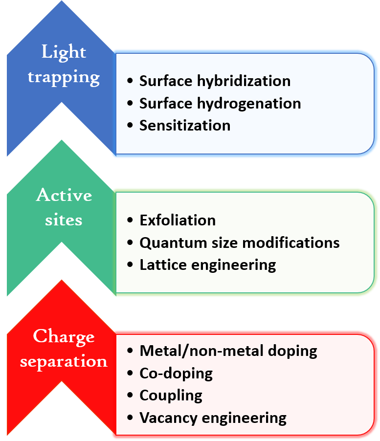 Various strategies have been adopted for improving the photocatalytic efficiency of TiO2. Some of them are listed in Fig. 2.