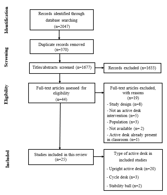 The PRISMA flow diagram presented in Figure 1 summarizes the study selection process. The search strategy initially found a total of 1677 references after removing duplicates. A total of 1635 articles were excluded after screening of titles and abstracts. Full text copies were obtained for 44 articles; of which 25 articles matched the inclusion criteria and were thus included in this systematic review. The main reasons for studies exclusion among the remaining were: (1) study design did not meet inclusion criteria (n = 8); (2) intervention did not use an active desk (n = 5); (3) population was not children without health issues (n = 3); (4) full texts were not available (n = 2); and (5) active desks were already integrated in classroom (n = 1). One article included two different study designs [31].