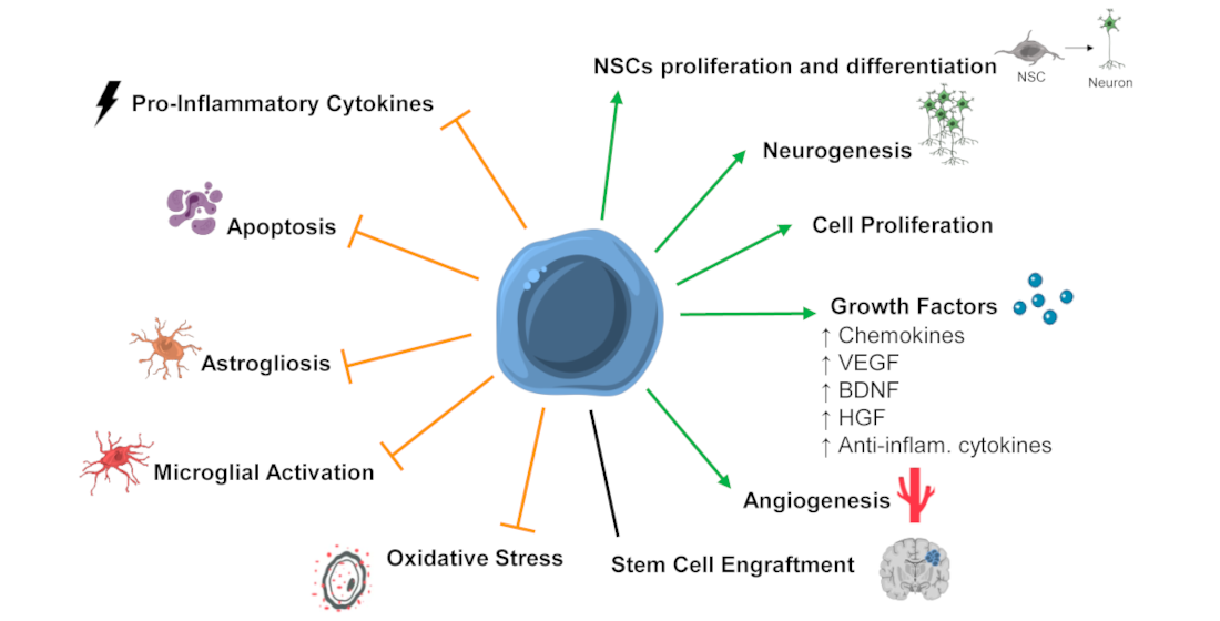In the last ten years, several studies focused on assessing the potential of SCT in preclinical models of HIE. These studies show that stem cell therapy could have positive effects after a hypoxic-ischemic insult in the perinatal period, with several positive outcomes identified: improved functional outcome, increased angiogenesis, increased neurotrophic and growth factors levels, and cell proliferation; reduction in the extension of brain damage, translated in decreased apoptosis; decreased microglial activation and/or astrogliosis, and neuroinflammation [23](Figure 1).