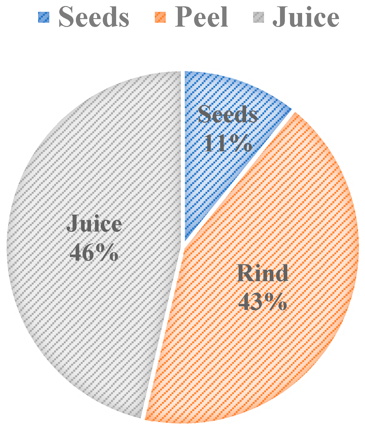 Figure 2 shows the weight percent composition breakdown of pomegranate parts. The breakdown shows that 46% w/w of pomegranate is used as a juice, and the rest of it is considered to be waste. The pomegranate rind is one of the waste components that comprises 43% w/w of the fruit. Seeds are another waste component of pomegranate and compose 11% w/w of the fruit (Figure 2). The oil content that is extracted from pomegranate seeds varies in weight percentages, depending on their cultivars, and it constitutes approximately 7.6–20% w/w of the pomegranate seed [11][12]. The oil content of pomegranate varies depending on the climate of the growing region, the maturity of the fruit, cultivation practices, and storage conditions [12]. To take cultivar variation in weight composition—that is a result of using different cultivars—into account, the average composition from three sources was used in Figure 2. Pomegranate processing factories will benefit from utilizing the waste components because the majority of the pomegranate fruit is disposed of as waste.