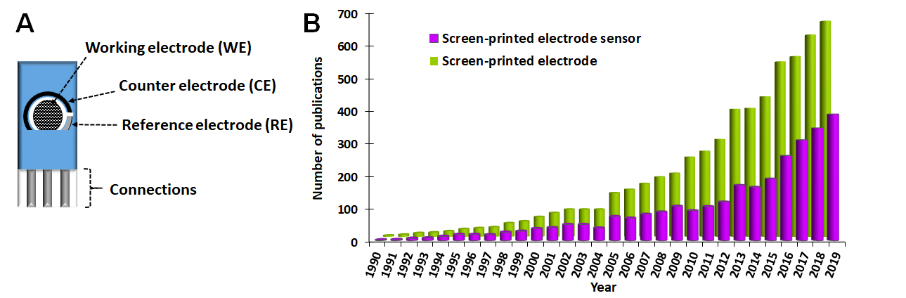 Figure 1. (A) Scheme of the most common configuration of a screen-printed electrode. (B) Number of publications per year when searching “screen-printed electrode” and “screen-printed electrode sensor” in Scopus database for the last 30 years (1990–2019).