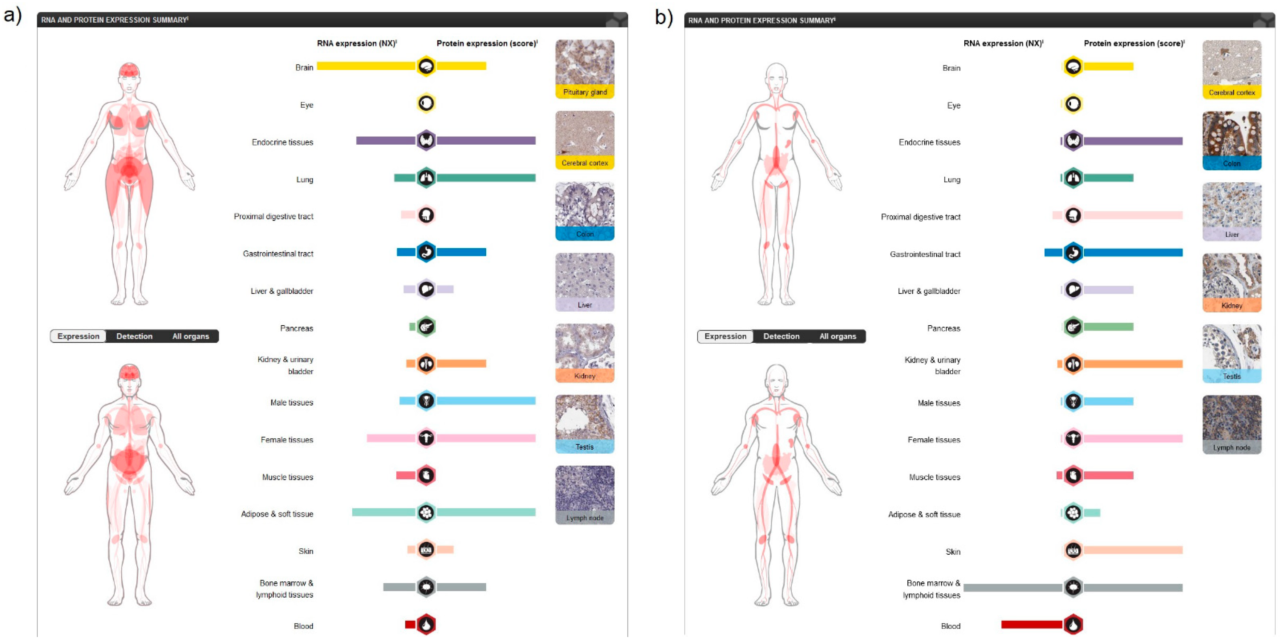 Analysing human tissue specificity by combination of expression profile data from various sources on the mRNA and protein level using the HPA Tissue Atlas subproject, it was detected that CB1R is tissue enhanced in the brain (mRNA level), and in adipocytes, pituitary gland and the central nervous system (CNS) (protein level) (Figure 2a), while CB2R is tissue enriched in blood and lymphoid tissue (mRNA level) and present in variable protein levels in most tissues (Figure 2b).