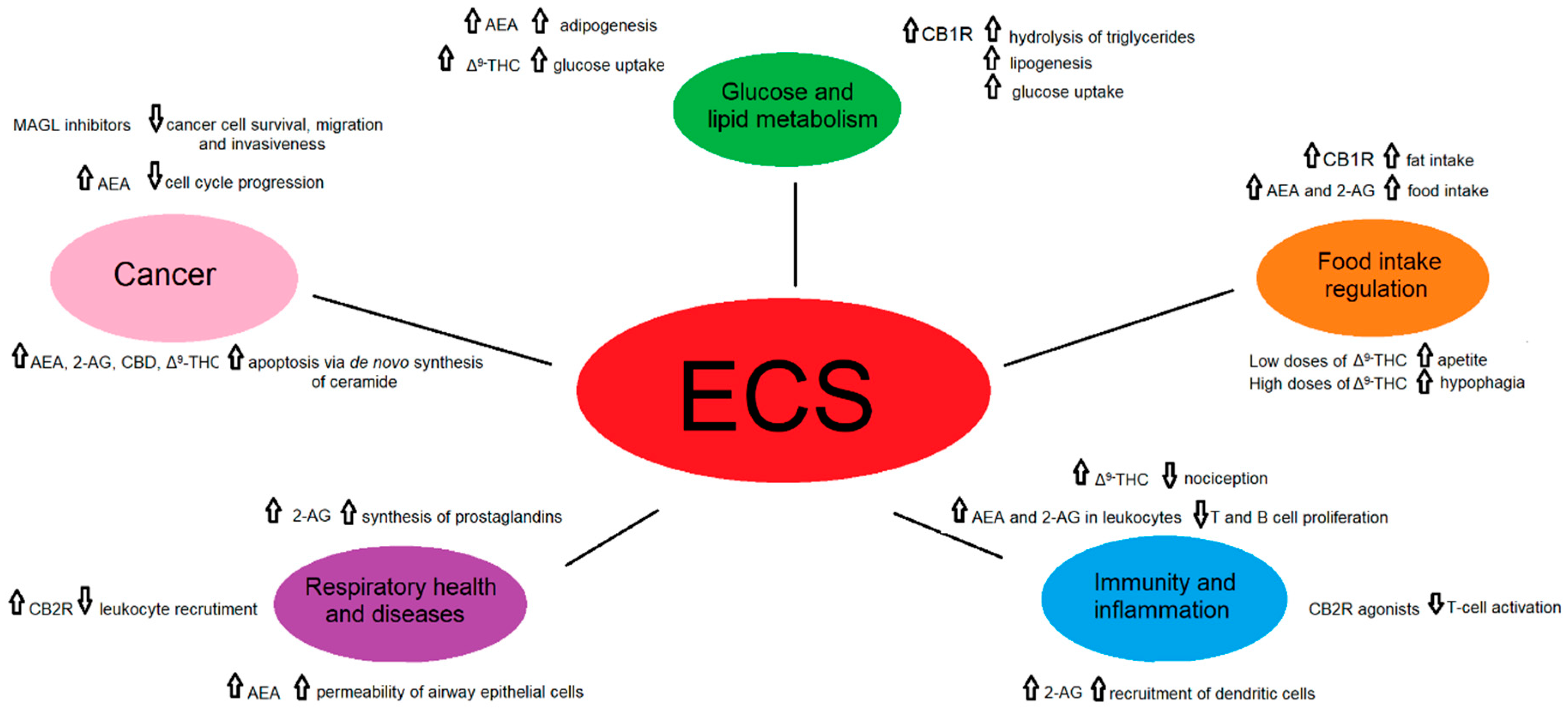 Considering the diversity of ligands, the number of receptors and heteromers, their tissue and cellular localization, as well as the vast network of other molecules belonging to the ECS, it is not surprising that this system is involved in the regulation of numerous essential physiological and pathological pathways [4] (Figure 3).