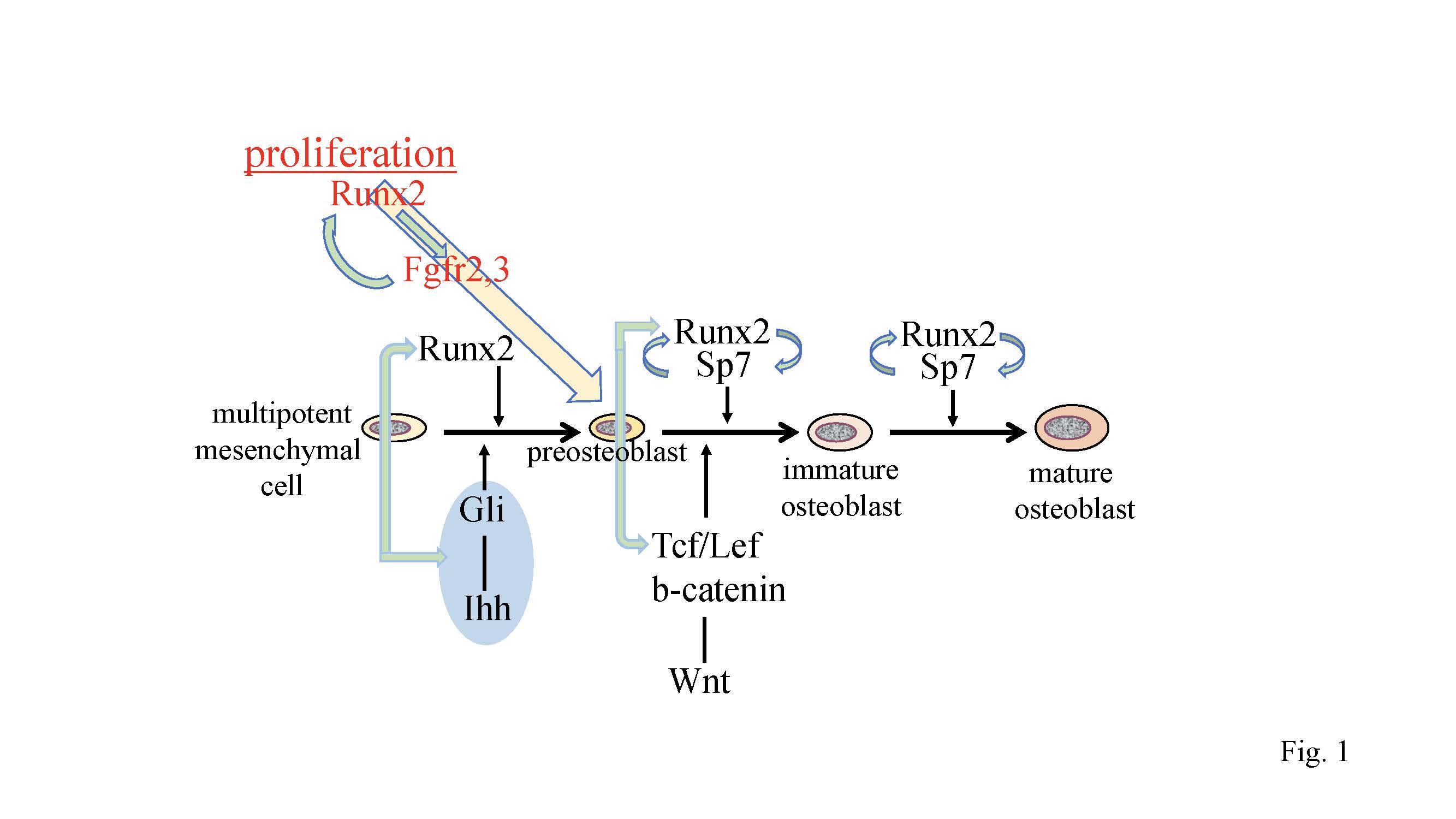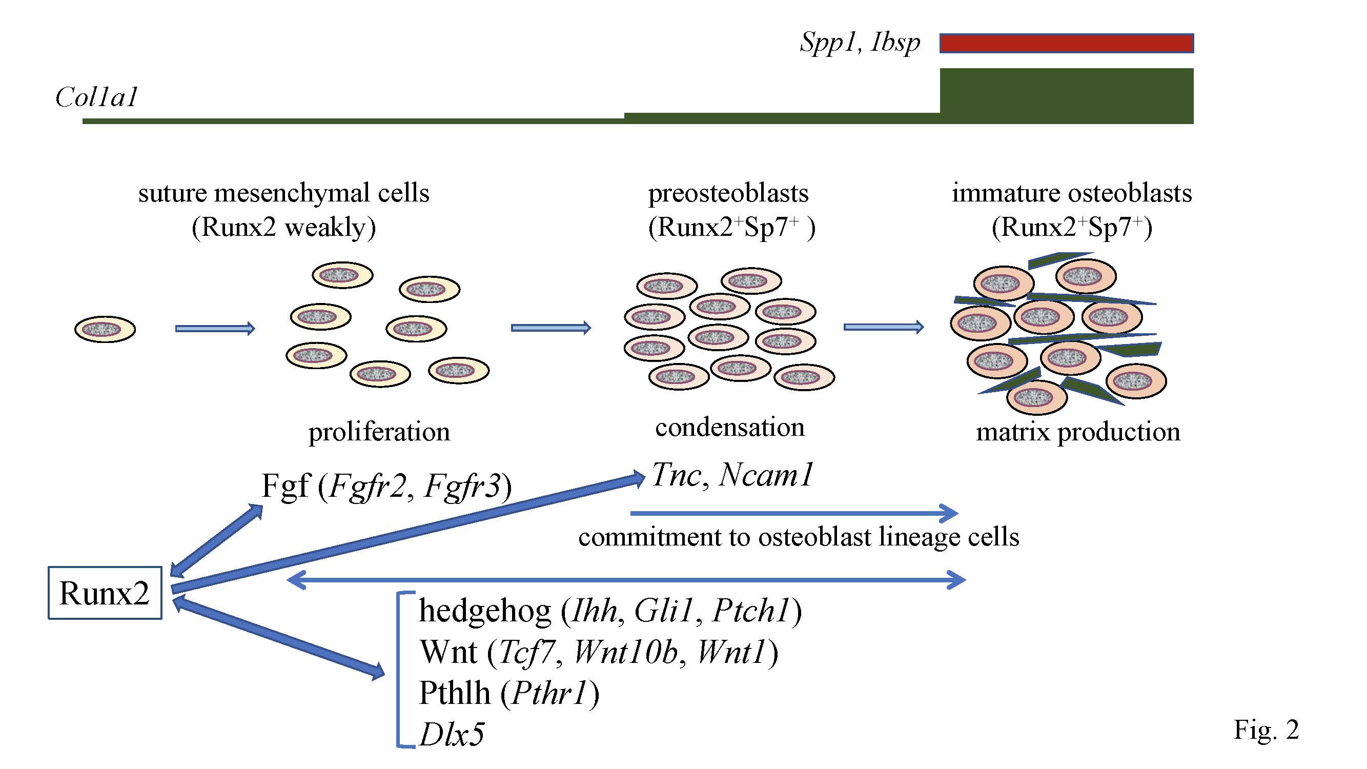 Runx2 is required for the proliferation of preosteoblasts in whole skeletons and mesenchymal cells in sutures. Indeed, Runx2 is required for the commitment of mesenchymal cells to osteoblast lineage cells. Thus, Runx2 makes a condensed cell layer of uncommitted mesenchymal cells or osteoblast progenitors by increasing their proliferation and facilitates their differentiation into osteoblast lineage cells. Runx2 can exert multiple functions through reciprocal regulation via major signaling pathways, including Fgf, hedgehog, Wnt, and Pthlh, and transcription factors, including Sp7 and Dlx5. Osteoblast proliferation and differentiation are likely regulated by such reciprocal regulation rather than the cascade of transcription factors. Runx2 target protein Ocn regulates the alignment of BAp and is required for bone strength but not for glucose metabolism in the pancreas, testosterone synthesis in testis, or muscle mass.