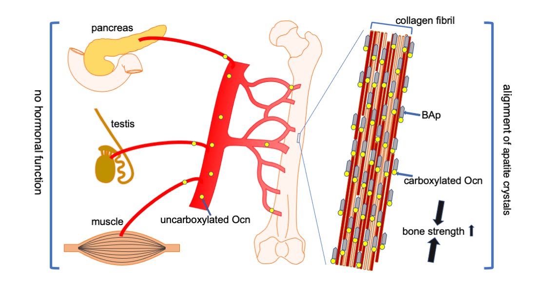 The functions of osteocalcin (Ocn), which is encoded by Bglap/Bglap2 that are directly regulated by Runx2, were controversial. Ocn was demonstrated to inhibit bone formation and function as a hormone, which regulates glucose metabolism in the pancreas, testosterone synthesis in the testis, and muscle mass, based on the phenotype of Ocn–/– mice by Karsenty’s group [51][52][53][54]. Recently, Ocn–/– mice were newly generated by two groups independently [55][56]. Bone strength is determined by bone quantity and quality. The new Ocn–/– mice revealed that Ocn is not involved in the regulation of bone formation and bone quantity, but that Ocn regulates bone quality by aligning biological apatite (BAp) parallel to the collagen fibrils [56]. Moreover, glucose metabolism, testosterone synthesis and spermatogenesis, and muscle mass were normal in the new Ocn–/– mice [55][56]. Thus, the function of Ocn is the adjustment of growth orientation of BAp parallel to the collagen fibrils, which is important for bone strength to the loading direction of the long bone. However, Ocn does not play a role as a hormone in the pancreas, testis, and muscle (Fig. 3) [57].