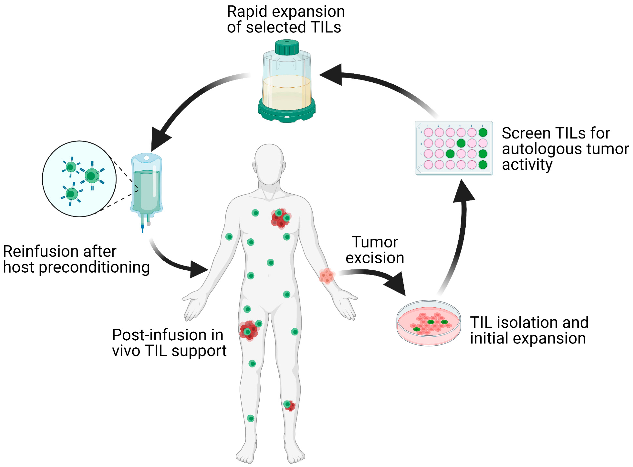 Solid malignancies encompass a wide range of diseases from lymphomas to carcinomas that affect nearly every organ in the body. The malignant transformation from normal cells is accompanied by progressive accumulation of genetic mutations. As a result, patients diagnosed with the same histological tumor type exhibit a wide range of genetic mutations and tumor microenvironments (TME). This inherent heterogeneity in tumors often leads to variations in patient-specific responses. Precision medicine, which refers to the tailoring of treatments to tumor-specific cellular or molecular characteristics, has recently became the mainstay of oncological therapy. The epitome of personalized therapy is adoptive cell transfer (ACT) with autologous tumor-infiltrating lymphocytes (TIL). This process involves tumor excision, isolation of TILs, ex vivo selection for autologous tumor reactivity, rapid expansion, and reinfusion of the T cell product back to the host [1] (Figure 1).