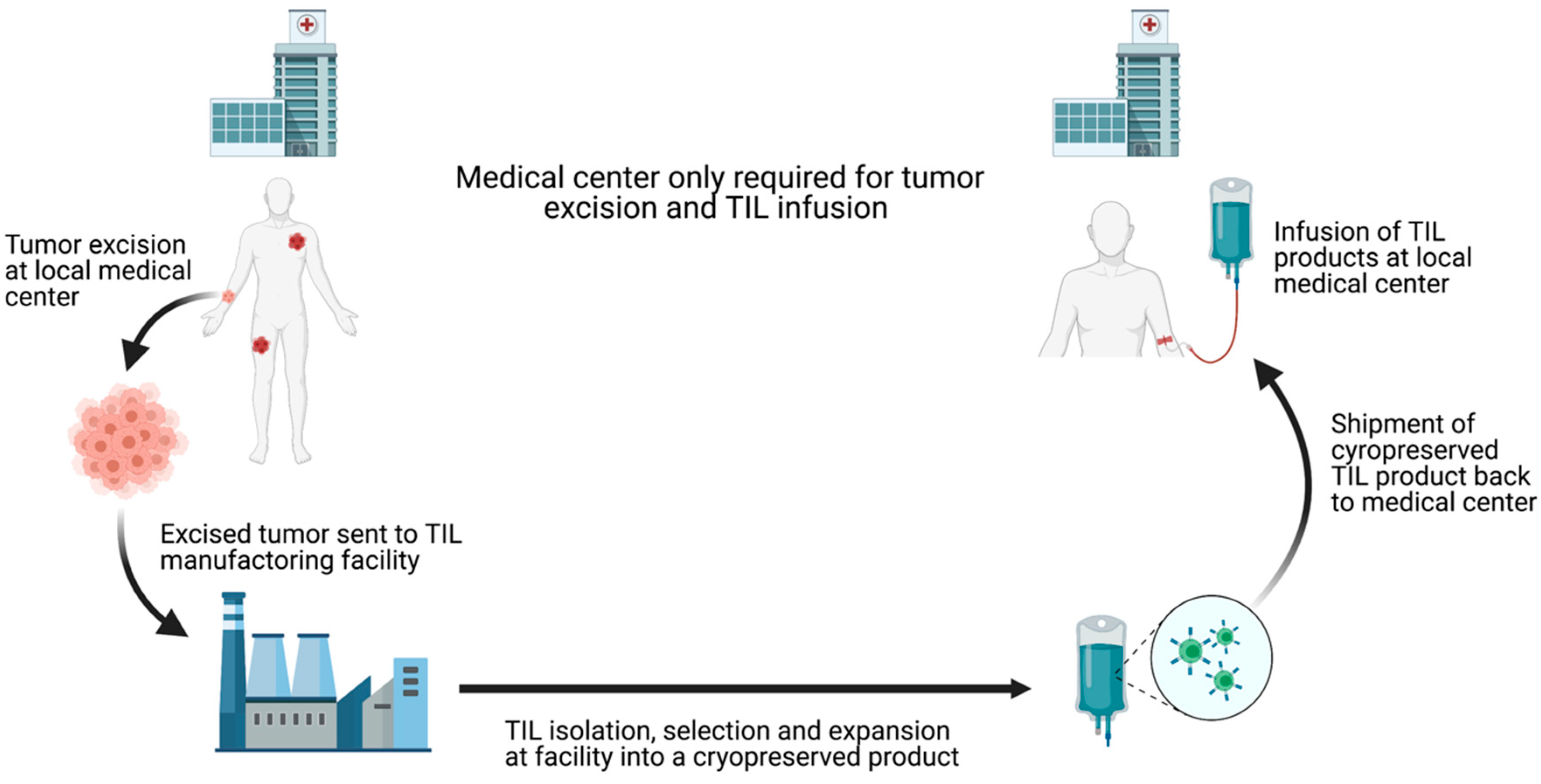 Although the clinical success of TIL-ACT has been replicated across multiple institutions, its availability has so far been limited to large academic medical centers. These centers have the expertise to successfully grow TILs and the capability to adequately manage adverse events patients experience [24]. The ex vivo TIL expansion protocol is labor-intensive and the requirement to use fresh TIL products for infusion impose further restrictions on the implantation. Outsourcing TIL production to dedicated manufacturing centers is necessary to increase the cost-effectiveness and expand the availability of this therapy [25]. Iovance Biotherapeutics has established a centralized, high-throughput manufacturing facility for the production of cryopreserved TILs (brand named Lifleucel). Iovance’s model involve receiving surgically resected tumors shipped by different medical centers, expanding TILs to therapeutic numbers in their central facility, and shipping cryopreserved TIL products back to the medical centers [26] (Figure 3). This alleviates the burdens on medical centers and theoretically allows TIL-ACT to be administered anywhere that has the capacity to surgically excise tumors and medically monitor patients during the reinfusion. Furthermore, cryopreserved TIL products offer more flexibility in scheduling as opposed to the rigid timeline dictated by the use fresh TILs. Despite the fact that TIL-ACT has yet to be FDA approved for the treatment of solid malignancies, strong preclinical and clinical results support its potential in eliciting durable tumor regression.