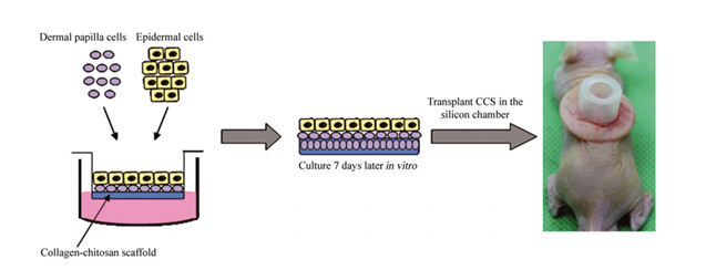 Figure 7. Schematic representation of inoculated DPCs and epidermal cells being transplanted in the silicon chamber on the back of the nude mouse. Reproduced with permission from.
