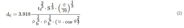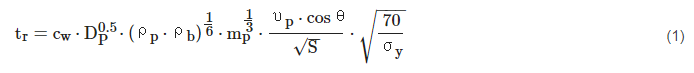 It defines a critical projectile diameter, dc (cm), based on material definitions, projectile speed and impact angle and panel composition (rear wall thickness (cm) and spacing between front and rear wall (S)). Here, υ represents projectile velocity (km/s) and σ is the yield strength of the rear wall (ksi).