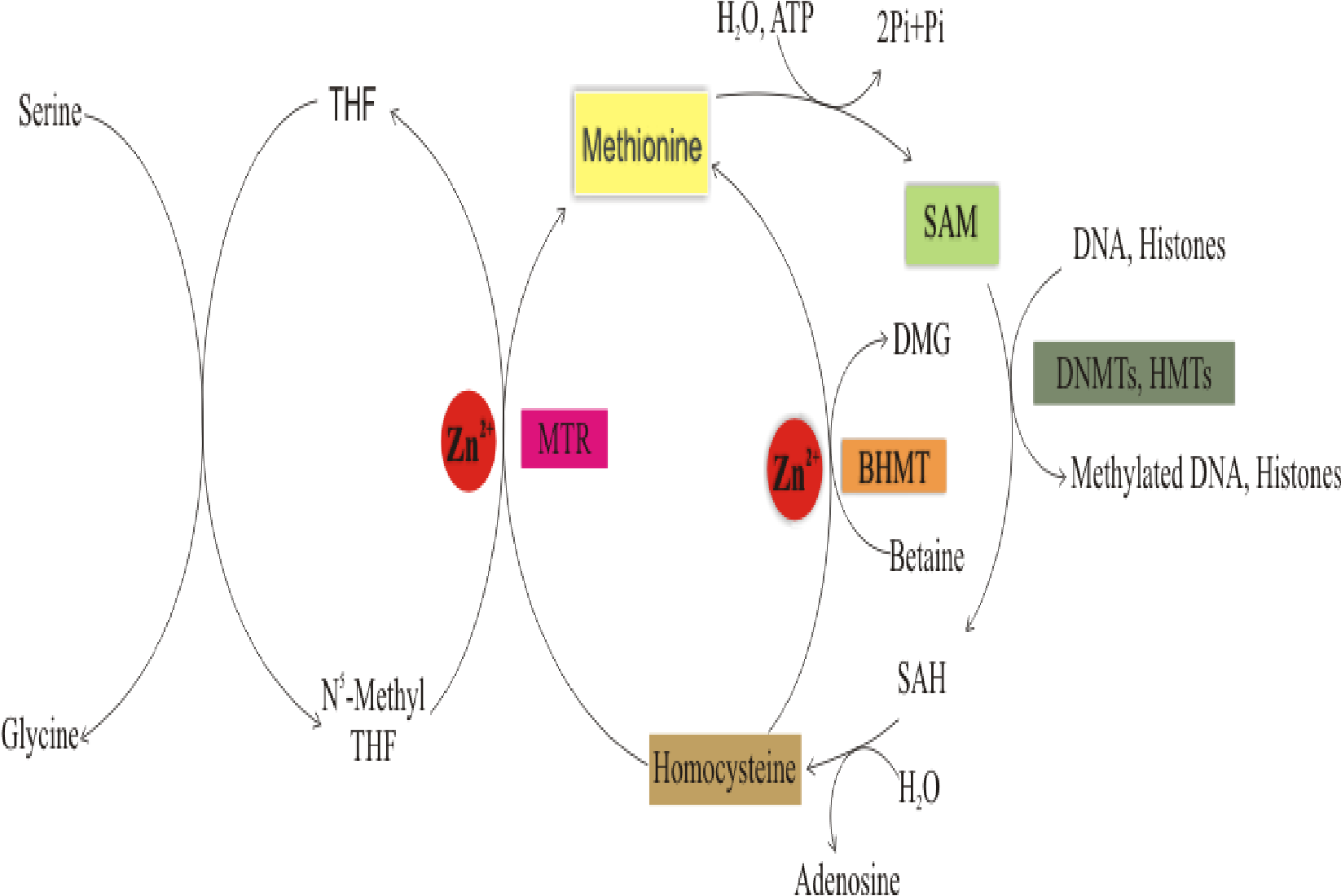Figure 2. Role of zinc in DNA and histone methylation through the folate-mediated one-carbon metabolism. This figure summarizes the pathways linking one-carbon metabolism with DNA and histone methylation. Zinc-dependent enzymes and key intermediates are highlighted in different colors. BHMT (orange) = Betaine homocysteine methyltransferase: A zinc-dependent enzyme, which catalyzes the alternate reaction of methionine synthesis; DMG = Dimethylglycine; DNMTS (dark green) = DNA methyltransferases: Catalyze DNA methylation and have zinc-binding domains that regulate their activities; HMTs (dark green) = histone methyltransferases: Catalyze histone, lysine, and arginine methylation; MTR (pink) = Methionine synthase: It is zinc-dependent and catalyzes the direct synthesis of methionine (the direct precursor of SAM) from homocysteine and N5-methyl THF; SAH = S-Adenosylhomocysteine; SAM (light green) = S-Adenosylmethionine: The activated methyl donor for methylation reactions; THF = Tetrahydrofolate: The active form of folate that supplies methyl groups to homocysteine to form methionine. Zn2+ (red) = Zinc ion.