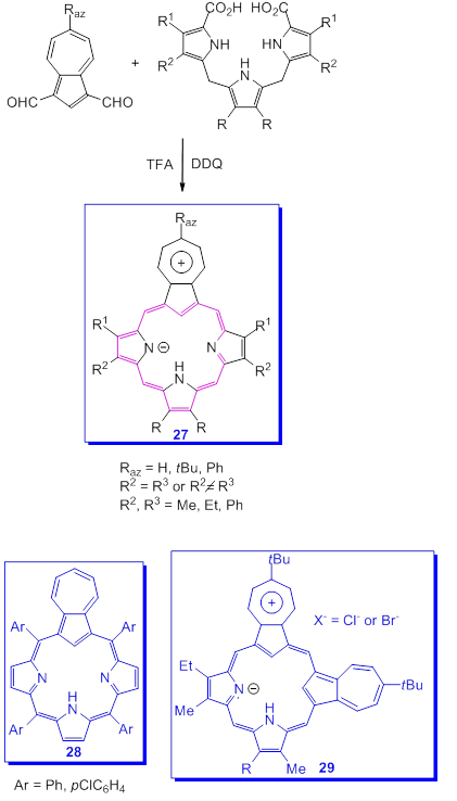 One of the synthesis of azuliporphyrins is based on the application of the “3+1”variant of the MacDonald reaction as it can be seen in Scheme 22 [58]. Azulene-1,3-dialdehyde was condensed with tripyrrane in the presence of HBF4, in dichloromethane followed by oxidation with DDQ. The compounds 27, porphyrin analogues, due to the participation of the five azulene ring at the stabilization of product, were generated in good yields. A large number of azuliporphyrins were also obtained by Lash's research team from which only two more examples, 28 and 29 were selected. In the last compound two azulenes moieties were inserted into the molecular structure.