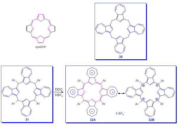 Finally and as a curiosity, the attempts to realize a system analog to that of porphyrin, in which the four five-membered rings belong to azulenes [59,60] will be presented. Starting from theoretically exciting however presumed quatyrin system (Scheme 23), analog to that of porphyrin, the beginning was the preparation of calix[4]azulenes, 30, by reacting azulenes with paraformaldehyde in the presence of florisil. However the realized molecules did not have the desired structure namely [18]annulene substructures with 26π electrons. Using the tetraaryl compound 31, after oxidation with DDQ and an addition of HBF4·Et2O, the tetracation 32 was generated. Surprisingly, the chemical shifts in 1H-NMR spectrum of 32 are consistent with a non-aromatic structure. This finding as well as the lack of coplanarity of the macrocycle, determined by X-ray spectra, seems to indicate the predominant participation of the structure 32B with the charges located at the four Csp2 compared to the structure 32A with the tropylium ions. Thus, the macrocyclic aromatic ring current is essentially absent.
