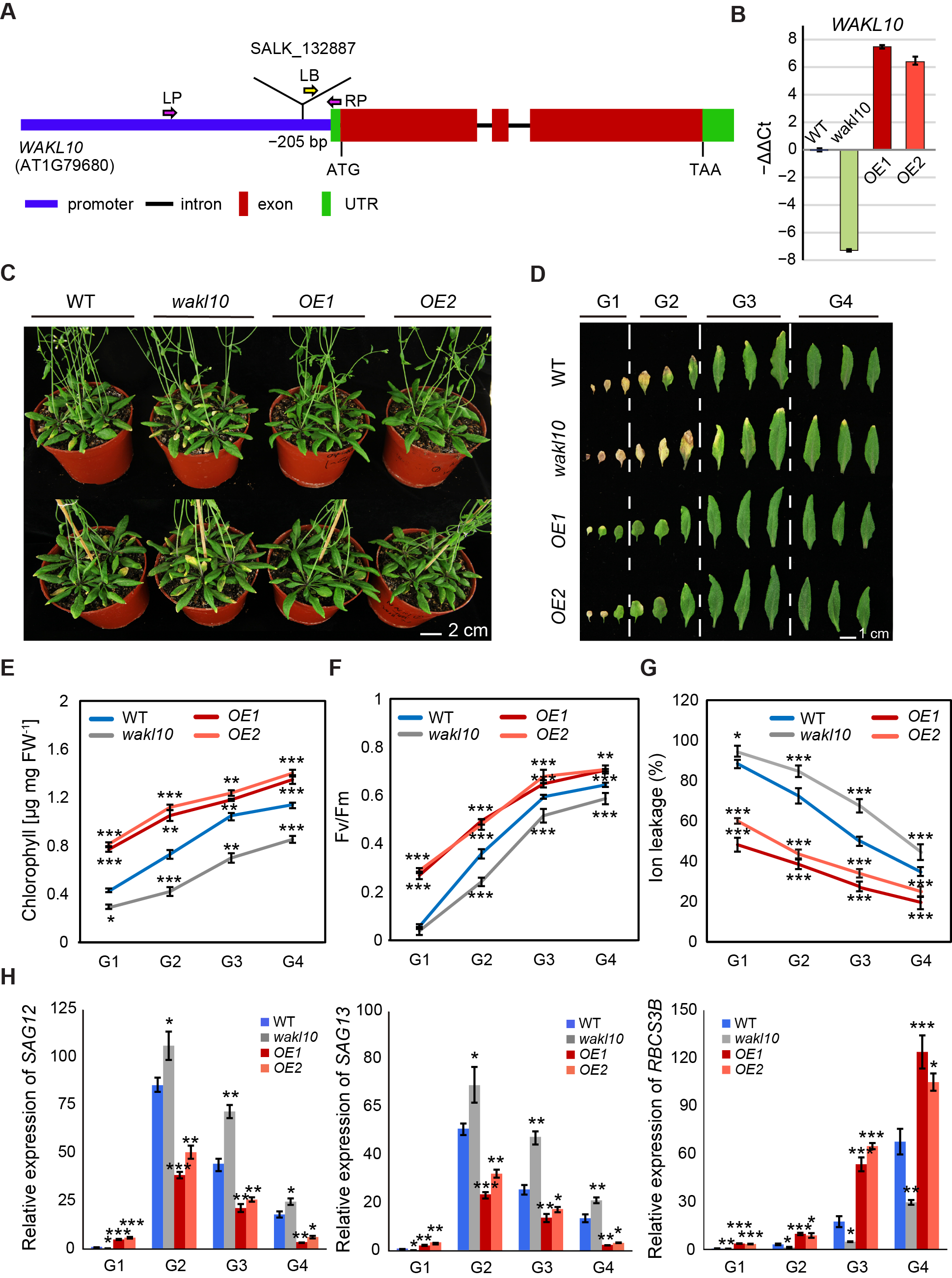 Figure 4. AtWAKL10 negatively regulated natural leaf senescence. (A) Schematic gene model of AtWAKL10. The T-DNA insertion site was shown, and homozygous mutants were screened using specific primers (Supplementary Table S1). LP (left primer), RP (right primer), left border primer (LB), ATG (start codon), TAA (stop codon) and UTR (untranslated region). (B) Quantification of AtWAKL10 in atwakl10 mutant and AtWAKL10 overexpression lines. Expression levels of AtWAKL10 were determined by qRT-PCR and presented as values of −ΔΔCt. Data shown were means ± SE of three independents plants. (C) Phenotypes of 7-week-old wild type (Col-0), atwakl10 mutant and AtWAKL10 overexpression lines (OE1 and OE2), and (D) a series of developmental stages of all leaves as indicated. Rosette leaves were divided into four groups according to the degree of senescence. Quantification of chlorophyll concentrations (E), PSII maximum efficiency (Fv/Fm) (F), ion leakage (G) and relative expression of SAG12, SAG13 and RBCS3B (H) in leaves from each group. Mean values ± SE were shown for three biological replicates. Significant differences (* p < 0.05, ** p < 0.01, and *** p < 0.001) compared with the wild type in each group were determined by Student’s t-test.
