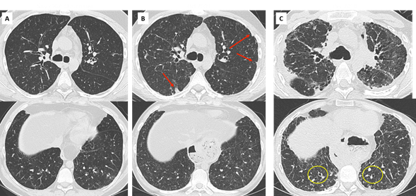 During follow-up and according to clinical and functional changes, CT may be used to exclude any treatable causes or complications of therapy, or to detect possible evolution to a mixed phenotype.