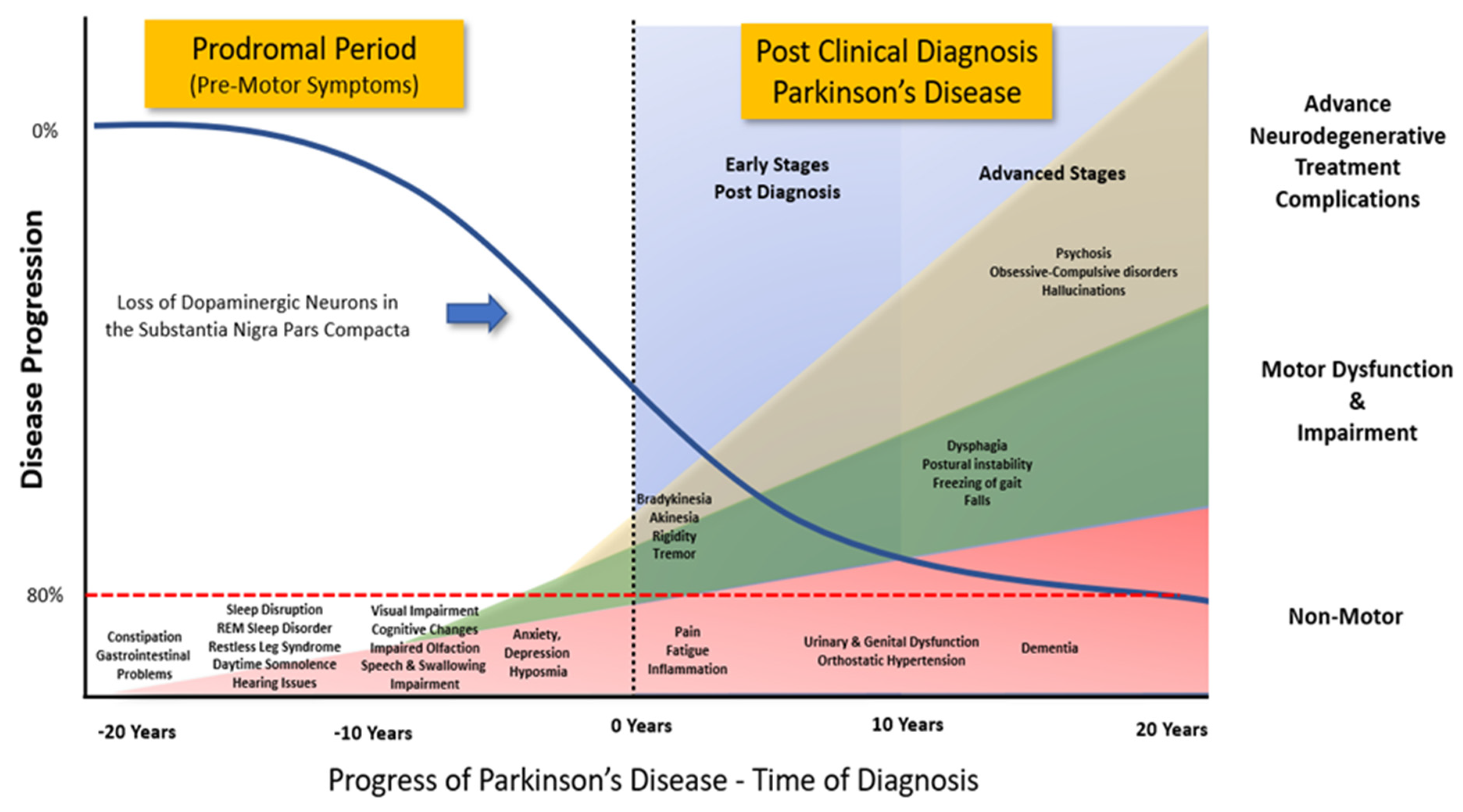 Figure 2. Progression of Clinical Symptoms from Early Prodromal through to Clinical Diagnosis of Parkinson’s Disease. Clinical diagnosis of Parkinson’s Disease accepts that there is a potential loss of up to 80% of the dopaminergic neurons in the Substantia Nigra Pars Compacta. However, prior to the emergence of any significant motor impairment, a wide variety of symptoms associated with non-motor dysfunction and disability usually precede the clinical diagnosis of Parkinson’s disease by 10-20 years. (Adapted from data and figures in Kalia et al., [61], Parkinson's disease. The Lancet, 386(9996), 896-912, and Tansey et al., [62], Inflammation and immune dysfunction in Parkinson disease.
