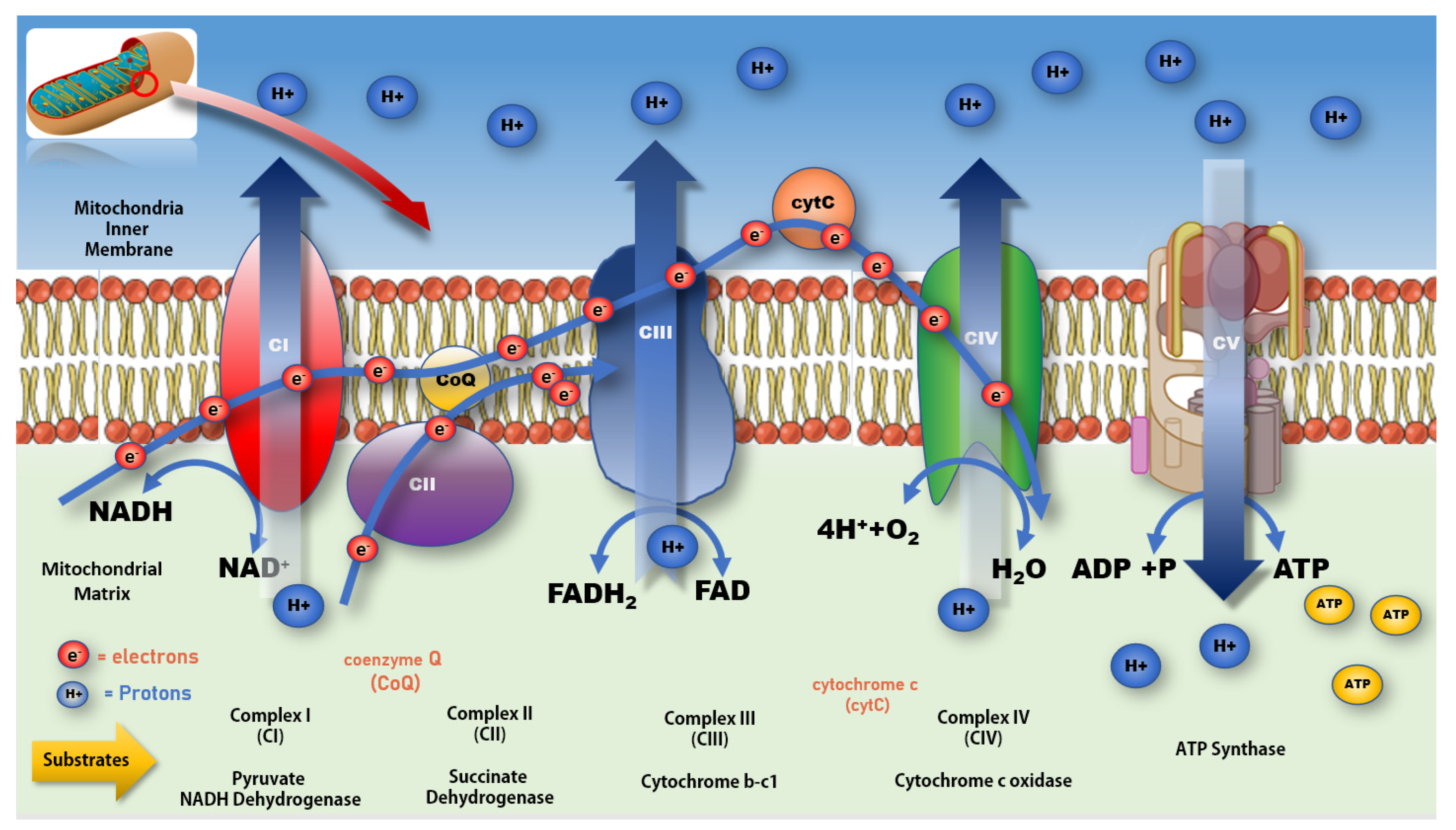 Figure 3. Mitochondrial electron transport chain and production of ATP. Impeding the flow of electrons along the ETC at CI increases production of free radicals resulting in a rise in oxidative stress and lower production of ATP at CV. A more complete review of mitochondrial bioenergetic function and associated impacts on various disease processes can be found in Protasoni et al. 2021 [70].