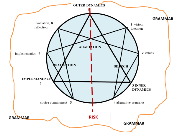 The Strategic Enneagram is symmetric. The strategic process is divided into a conceptual phase sequence 1, 4, 2, and action phases 8, 5, 7; a reflective phase 7, 1 posing the question “Is the original vision being implemented”? a control phase 2, 8 asks. Do ourthe actions embody ourthe values? Taken together phases 7, 1 and 2, 8 reflect the continuous adaptation and revision necessary to any decision process as circumstances (inner and outer dynamics and desired payoffs) change. The Strategic Enneagram is symmetric around risk since risk emerges when cognition (vision, feelings/values and imagining alternatives) becomes action (implementation). Everything and anything can be imagined, but is what is imagined feasible? Can it be realised in spacetime?