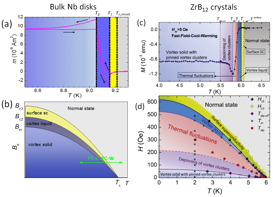 Figure 5. (a) DC m(T) measurement on a bulk Nb disk down to 8.2 K (applied field of 5 mT (5 Oe)). Note here the lower peak on the up-run being at a much higher temperature as compared to the peak measured on the down-run. (b) Schematic phase diagram constructed from the m(T) and m(H)-measurements on the Nb disks. (c) Temperature dependence of the magnetization in the fast field-cool warming (FFCW) mode at 0.5 mT (5 Oe) on ZrB12 crystals [37]. (d). Phase diagram for the PME in FFCW mode. The third critical field Hc3 is defined from the onset of the diffraction paramagnetic effect (DPE) seen as a peak in the in-phase ac susceptibility measurements; Hc2 is defined from the intersection of two linear fits of the m(T) curves above and below the onset; Tirr is derived as the onset of a diamagnetic signal on the in-phase AC susceptibility curve. The solid and dashed lines are plots of the empirical formula H(T) = H0 [1- (T/Tc)2]n. The black crosses show the field locations where magnetic relaxation curves are measured (not shown here, Fig. 6 of [37]). Images (c) and (d) reproduced with permission from [37].