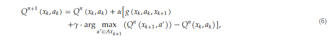 (𝑥𝑘,𝑎𝑘)has a related Q-value and the agent in each state chooses the action with maximum Q-value and reaches the next state. The Q-values are in relation to rewards or penalties the agent gained during its training process (experiences). Q-value for each state action is dependent on its immediate reward and those it might gain in the following next states based on the following equation: