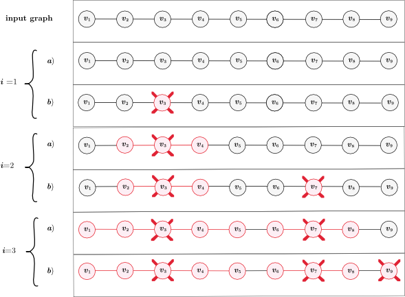 Figure 1. An optimal burning sequence for a nine vertices path is (𝑣3,𝑣7,𝑣9). The burning process of this sequence is depicted by each 𝑖 ∈ {1,2,3} with its corresponding steps a and b. Notice that vertex 𝑣3 burns all vertices at distance at most 2, vertex 𝑣7 burns all vertices at distance at most 1, and vertex 𝑣9 only burns itself.