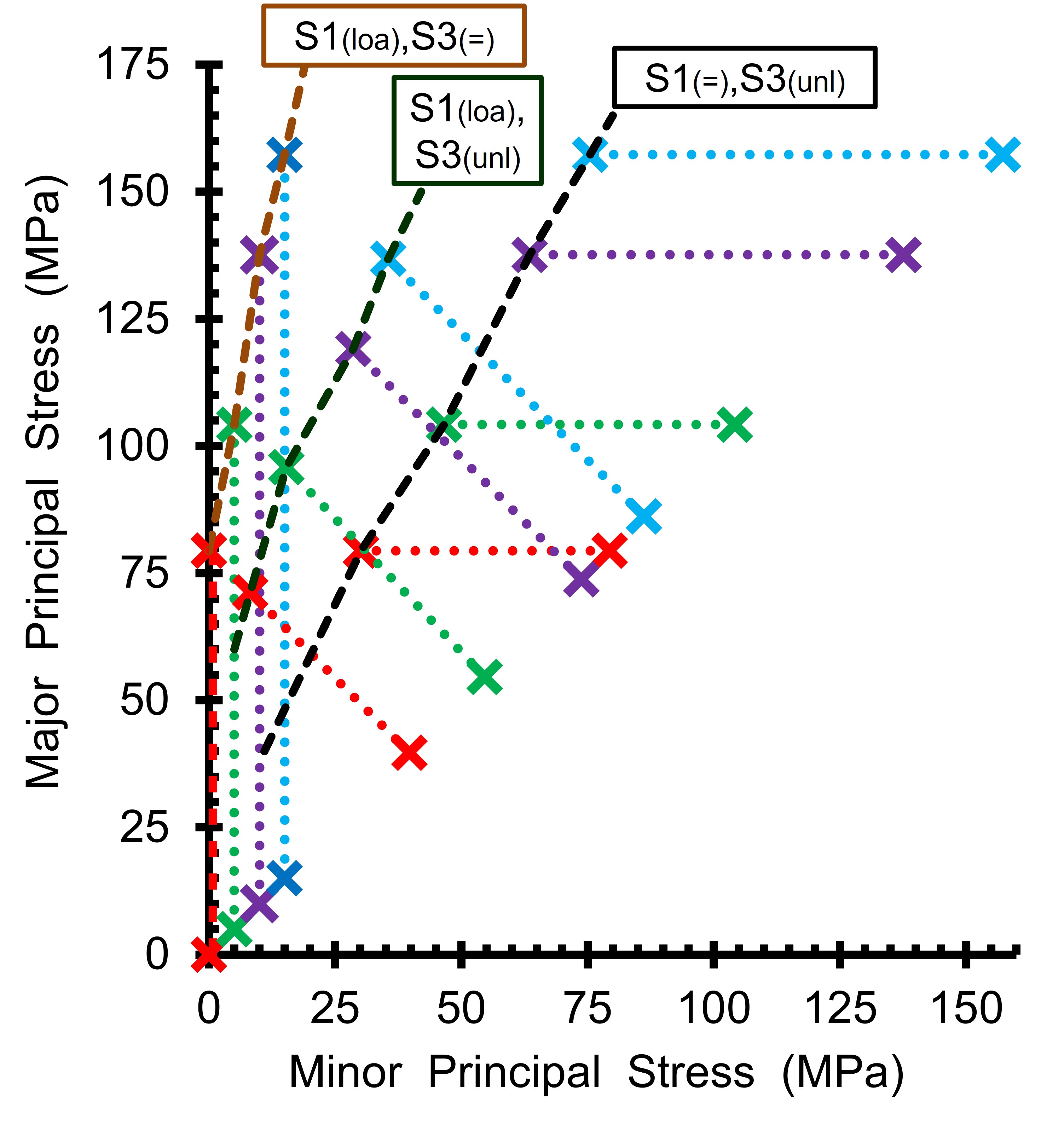 Figure 1. Failure envelopes for the three basic types of stress paths (i.e., uniaxial loading (S1(loa),S3(=)), uniaxial unloading (S1(=),S3(unl)), and simultaneous loading and unloading (S1(loa),S3(unl))[2]. The start of each stress path (i.e., an isotropic stress state) and failed stress states are indicated by crosses.