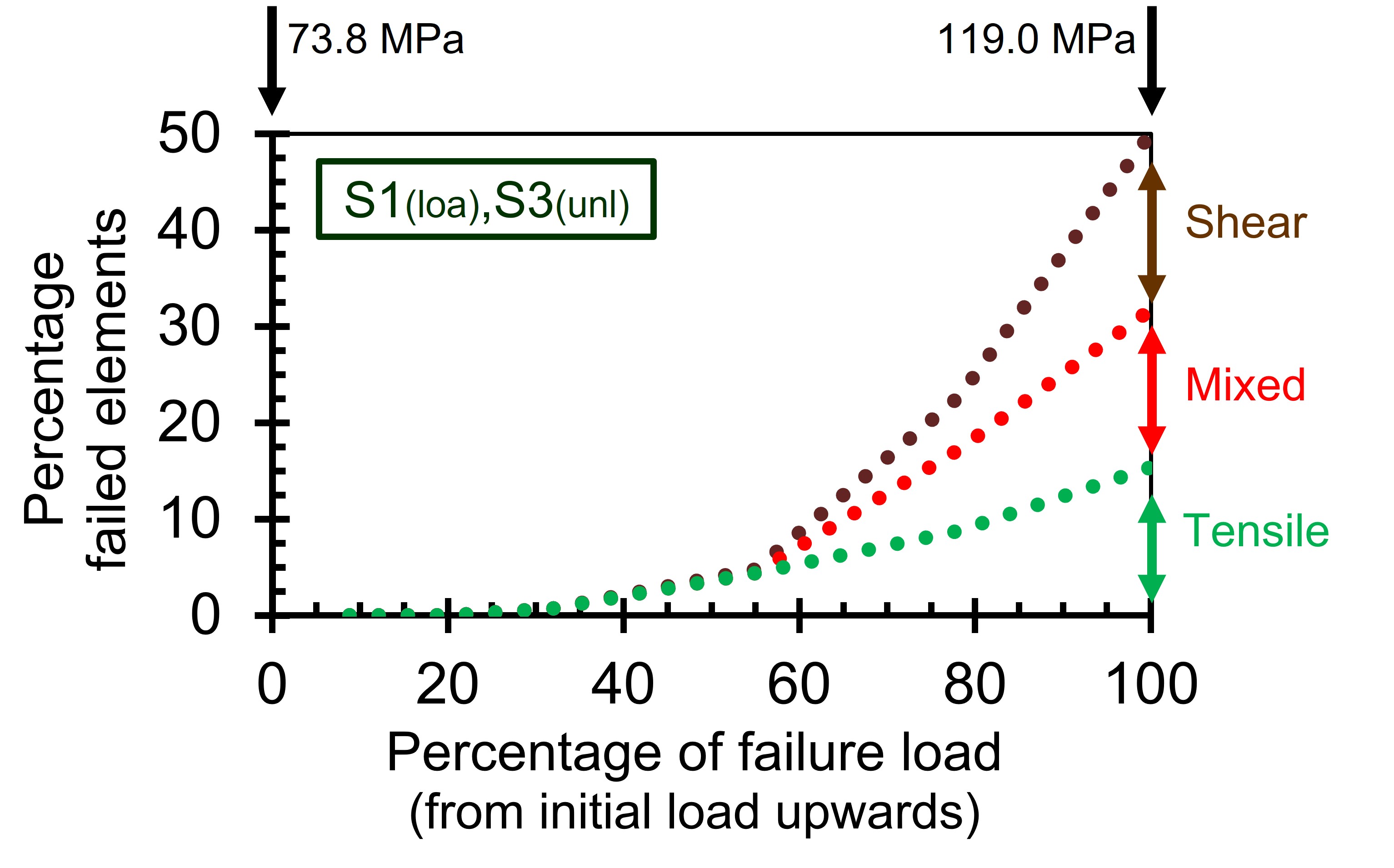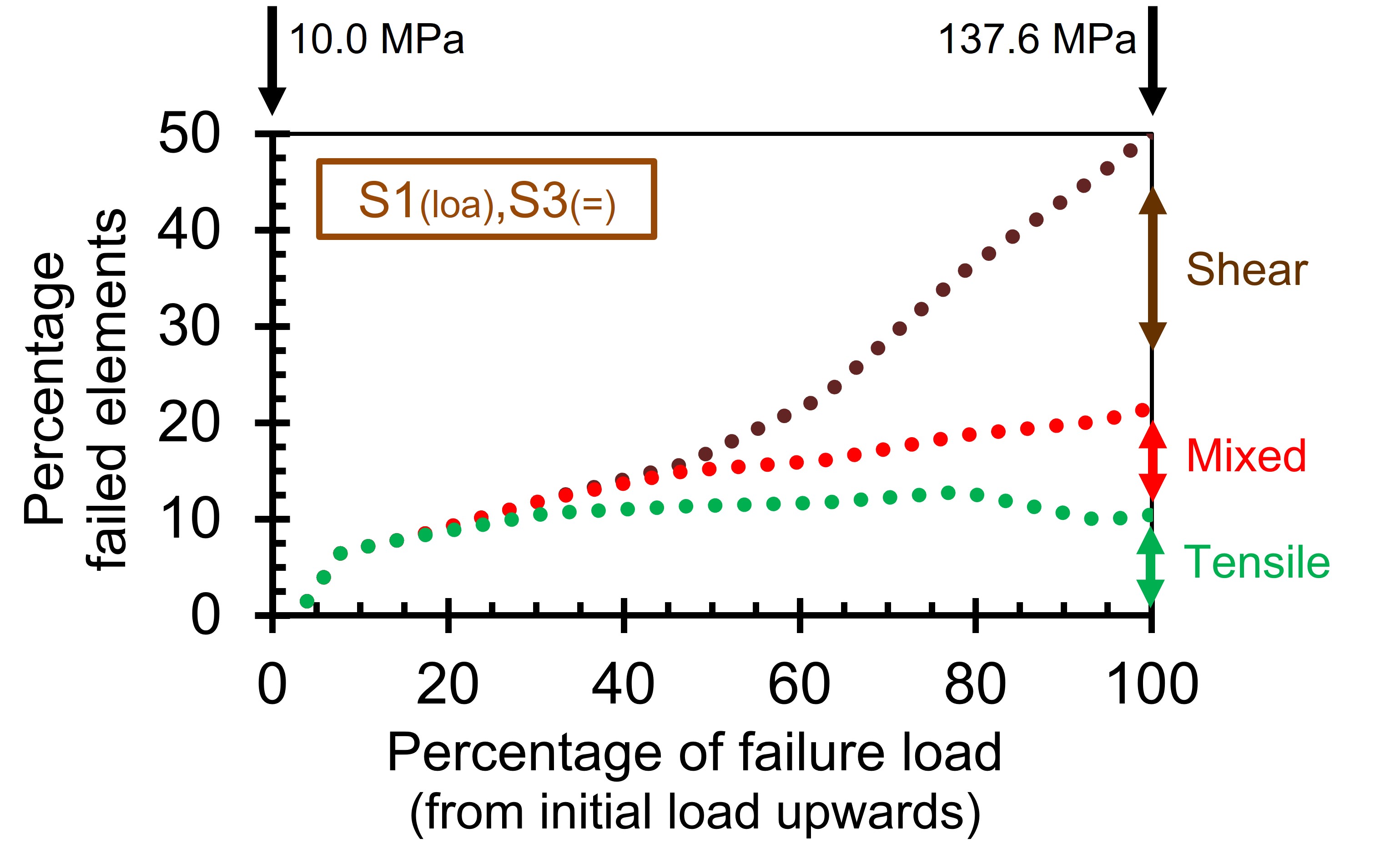 Figure 2. Variation of the contact failure modes (i.e., tensile only, shear only, and mixed mode) as a function of the stress path, i.e., from the initial isotropic stress state until the load level of failure, corresponding to 50% failed contacts[2]. Two types of stress paths are presented as an example. The initial and final failure loads in absolute values are presented at the top of each graph. (a) Uniaxial loading, S1(loa),S3(=), major principal stress levels are presented; (b) simultaneous loading and unloading, S1(loa),S3(unl), major principal stress levels are presented.