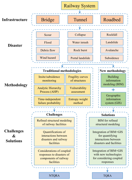 This paper reviewed different disaster risk assessments adopted in railway engineering construction, owing to the complicated physical and functional characteristics of its facilities, multiple hazards surrounding their construction, and interdependencies between infrastructure and components. Moreover, the summarization of risk assessments focusing on railway bridges, tunnels, and roadbeds is a crucial factor that should be considered when estimating QRA based on new technologies. Based on an overview of disaster risk assessment for major railway facilities (e.g., bridges, tunnels, and roadbeds), this paper highlights the limitations of previous studies and presents three significant challenges for the practical application of TQRA, which are (1) the refined structural modeling of railway facilities, (2) the quantifications of interactions between disasters and railway facilities, and (3) the considerations of coupled responses to disasters of components of railway facilities. These issues severely limit the implementation of TQRA in railway construction and make achieving a refined and accurate disaster risk assessment for railway facilities problematic. Therefore, it is urgent to establish a highly effective and refined QRA approach based on new technology, which will reduce the damage of hazards and allow scientific research on disaster prevention measures. Despite BIM+GIS technology being the current technological development trend for the AEC industry, certain issues should still be addressed. The present cost of digital 3D modeling visualization is expensive, including the precise data required for modeling, labor cost, software and hardware equipment expenditures required for modeling, and so on. In the future, lightweight and practical modeling approaches may be developed. Dynamic monitoring on the status of the surrounding environment and the inside system may be dependent on the IoT. Computer numerical simulation techniques may be employed in analytical computations for complicated structural facilities. Nevertheless, BIM+GIS technology presently lacks a unified interface technique and rules with these new technologies. Future work will concentrate on improving BIM+GIS compatibility with other innovative technologies.