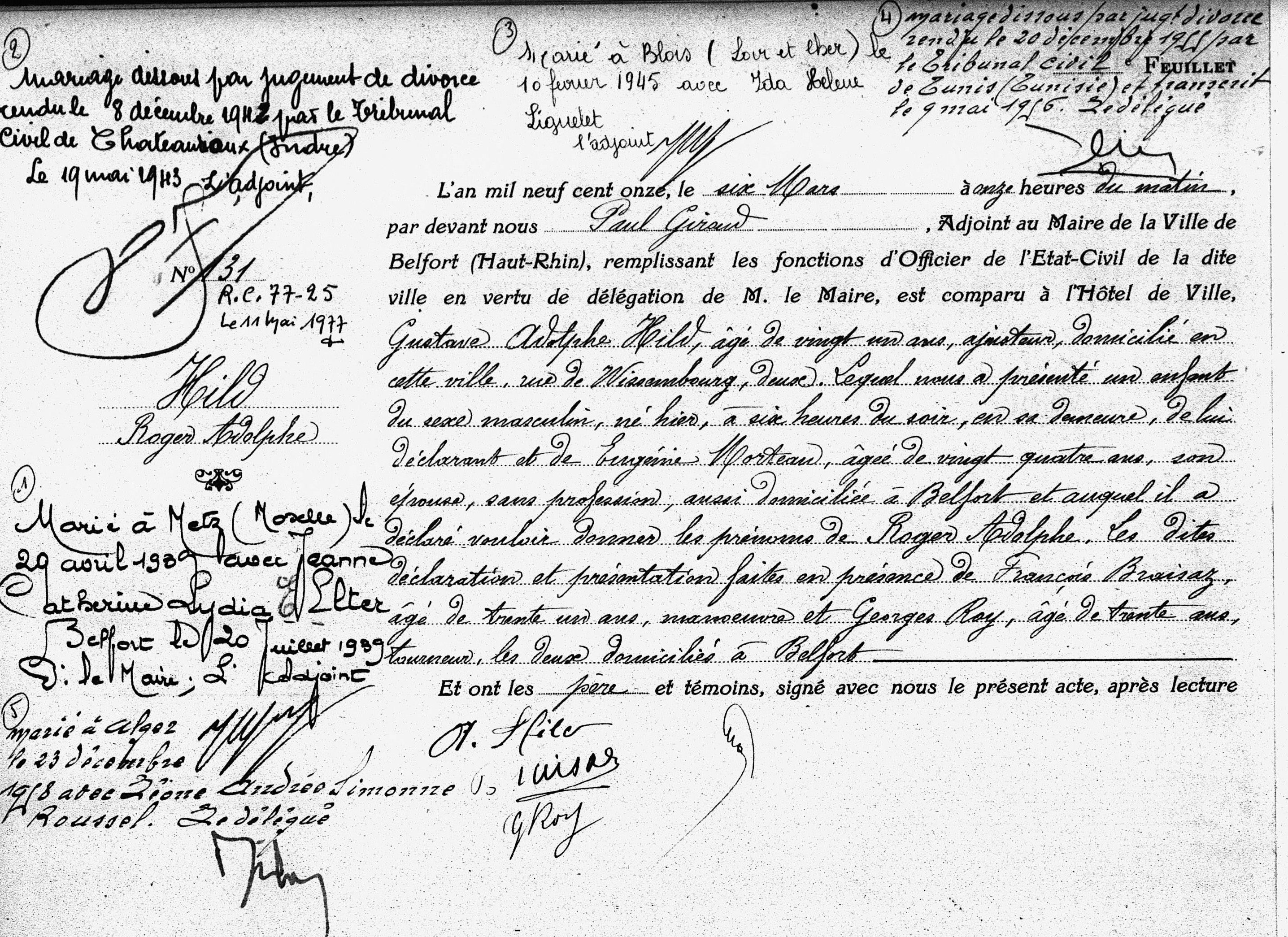 Figure 3. Sample of Belfort civil registers of births, featuring a hybrid mix of printed and handwritten text, along with marginal annotations.