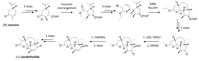 Figure 6. Total synthesis of (+)-cladantholide, as originally reported [59] and summarized [60]. Details of the 16 steps can be found in the original reports.