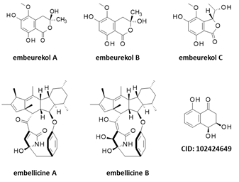 [69] Ebrahim, W.; Aly, A.H.; Mándi, A.; Wray, V.; Essassi el, M.; Ouchbani, T.; Bouhfid, R.; Lin, W.; Proksch, P.; Kurtán, T.; Debbab, A. O-heterocyclic embeurekols from Embellisia eureka, an endophyte of Cladanthus arabicus. Chirality 2013, 25, 250–256.