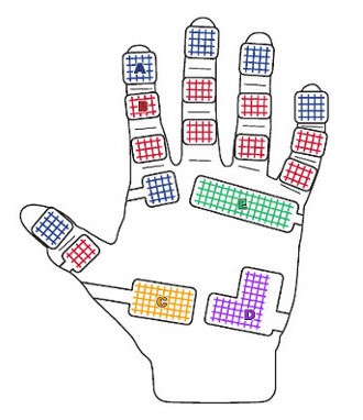 Figure 1. (a) Image of typical flexible, piezoelectric elements [26][36]; (b) Schematic image of a glove with piezoelectric elements positioned over critical areas of a glove that fits over a hand to detect force in the corresponding hand positions. Images courtesy of Tekscan.