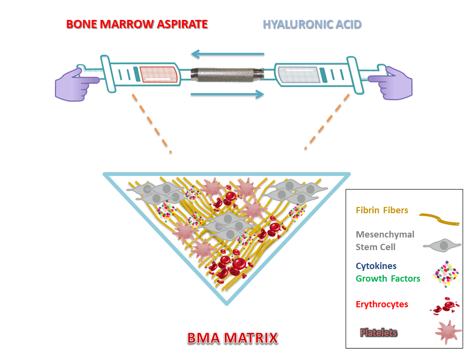 Bone marrow aspirate (BMA) Matrix. The combination of BMA with hyaluronic acid (HA) enables the formation of the BMA matrix, proposing a novel strategy towards the enhancement of regenerative mechanisms and possible synergistic effects. The crosslinked fibrin fibers derived from the BMA clot form a natural scaffold, supporting cellular activity and reconstruction of damaged tissue.