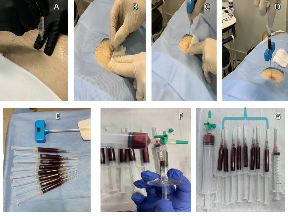 G) Bone Marrow Aspirate Matrix inside the 3 mL syringes (indicated by the blue bracket).