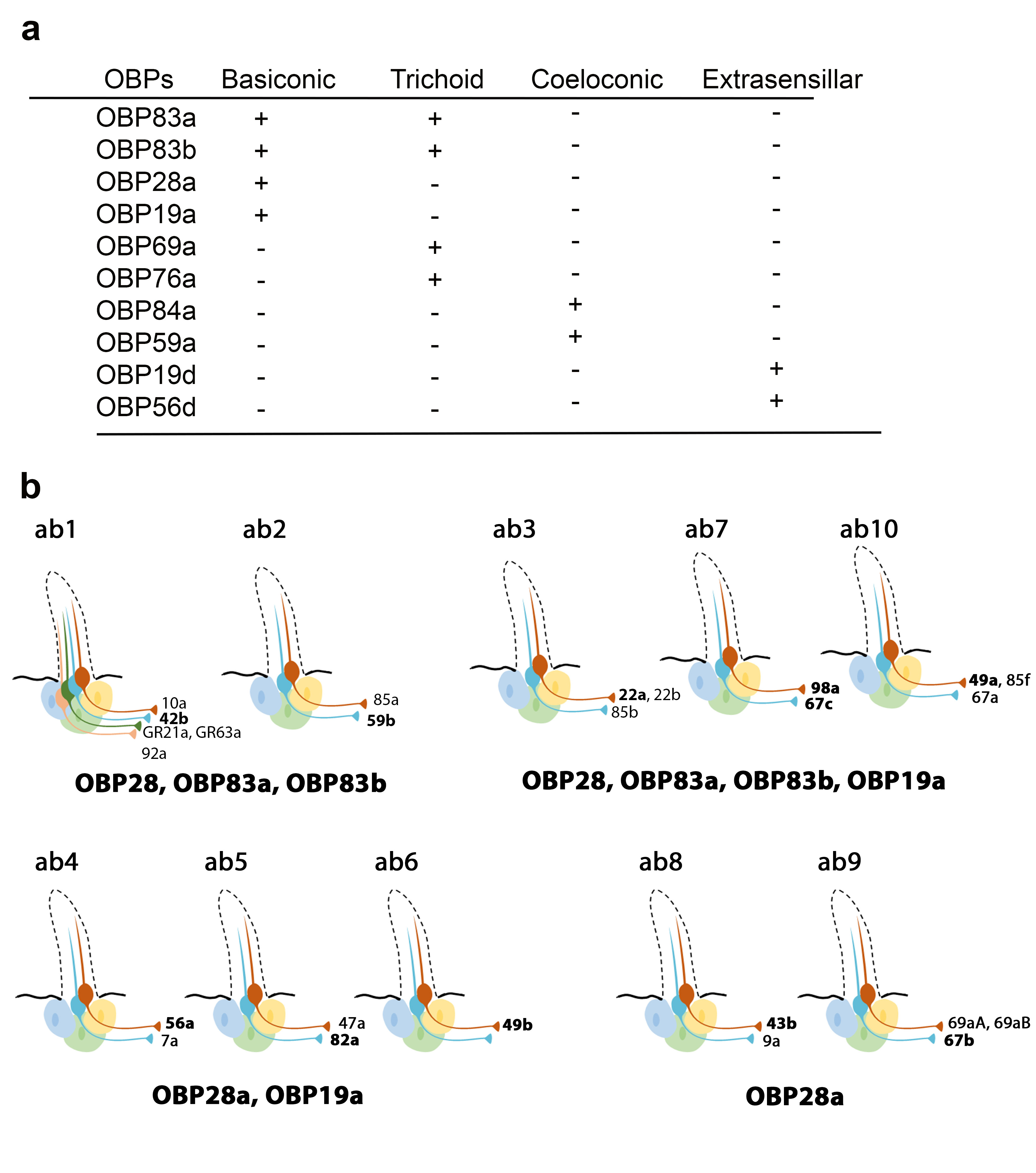Figure 1. Expression patterns of the most abundant OBPs in Drosophila antennae. (a) Summary of the OBP expression patterns in the three types of antennal sensilla. OBP19d and OBP56g are expressed in epidermal cells. (b) Distribution of highly abundant OBPs expressed in Drosophila antennal basiconic sensilla. Olfactory receptor (OR) genes expressed in each olfactory receptor neuron class are indicated (all the OR genes except for GR21a and GR63a). The OR markers used for in situ hybridization for each sensilla are shown in bold [28][34].