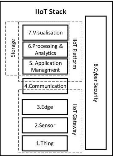 An illustration on an IIoT stacks system is shown on Figure 6. IIoT systems contains different layers that communicate and integrate in coherence with one another without interfering with existing automation logic of the physically connected entities. There are multiple options to consider when building the IIoT stack, this can depend upon existing capability and the application needs.