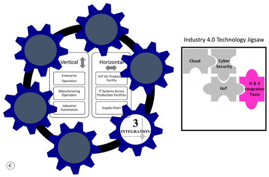 There are number of key challenges associated with the integration stage. They include: (i) interoperability (breaking down the silos in the factory floor machines and equipment’s that speak different languages depending on the communication protocols set by the vendors); (ii) data security (privacy issues with external sources and third parties in the horizontal integration as it requires data to be kept secured and accessed on a need to know basis); (iii) scalability (easily scaling the IT infrastructure by shifting IT systems operation to the cloud when data volume and velocity significantly increase with time); and (iv) adopting cost-effective IT applications (with strong orchestration capability to handle the integration complexity as well as providing end-to-end visibility with robust tools for data analytics to be performed) [70][63][71][38,70,76].