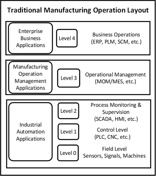 IT systems in the manufacturing industry have been traditionally developed to collect data and manage work processes within manufacturing, to meet specific functional areas within each operational level [65][72]. These systems have been purposely built to resolve specific set of issues and often operate independently. They have difficulty obtaining data across operational levels and they can’t scale or sustain with the increasing complexity of manufacturers needs [65][72]. For example, enterprise resource planning (ERP) systems used in the business operation level play a major role in connecting day-to-day activities across the manufacturing facility, providing essential insights into operations and the manufacturing process integrated into one database [66][73]. In the operational management level, manufacturing operation management (MOM) systems and manufacturing execution systems (MES) operates to bridge the gap between the enterprise business level and the automation levels but there are limitations and complexities associated with connectivity and vertical integration of real-time production data [33][67][35,74]. They are still heavily dependent operators’ inputs and lack data processing analytics capabilities.